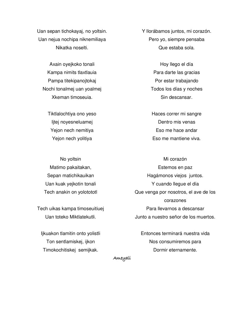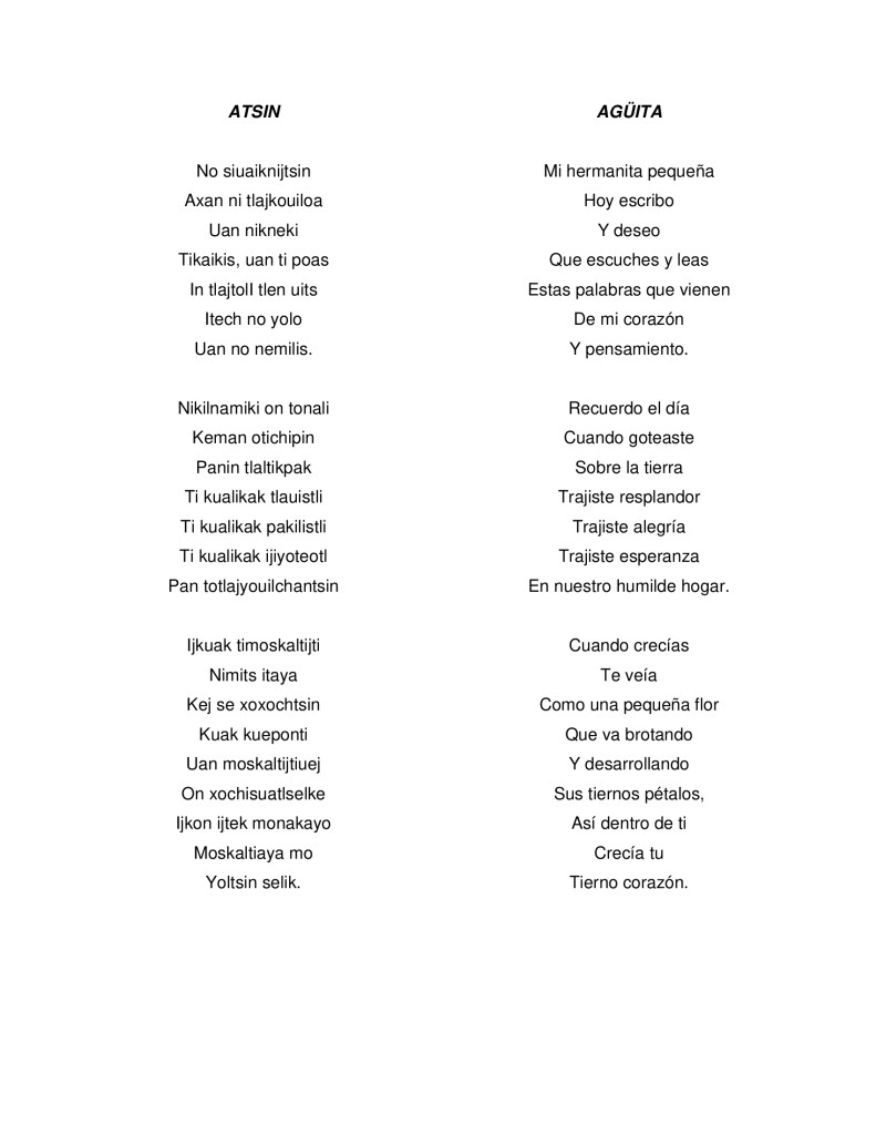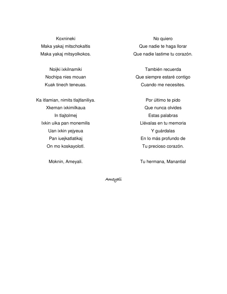 Les compartimos dos poemas en náhuatl, variante de Xalpatláhuac, Montaña de Guerrero, de la joven Anahí Martínez Pinzón (Ameyali).