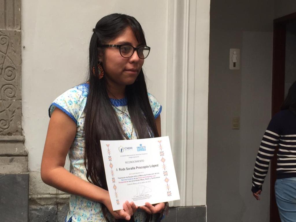 Rode Soralla Procopio Lara, es originaria de Atitlan, municipio de la región Mixe de Oaxaca, es licenciada en Comunicación Comunitaria, durante la presentación del Estudio sobre el Marco de Protección de los Derechos de las Personas Indígenas con Discapacidad en las comunidades Maya, Otomí y Tarahumara de la Comisión Nacional de los Derechos Humanos (CNDH), demandó respeto, verdadera inclusión y no discriminación en contra de las personas indígenas con discapacidad.