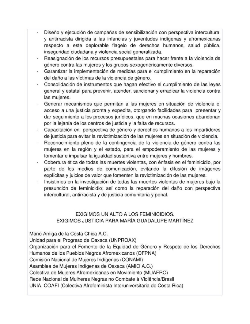 Tras transmitir sus condolencias a su familia, a la comunidad y a los Pueblos Indígenas y Pueblos Negros de la región, señalaron que la Fiscalía General del Estado de Guerrero (FGE) abrió una carpeta de investigación contra el probable responsable del delito de feminicidio, identificado como Armando «N», quien fuera pareja de María Guadalupe Martínez, pero no ha sido así con todos los crímenes que deben tener esta tipificación.