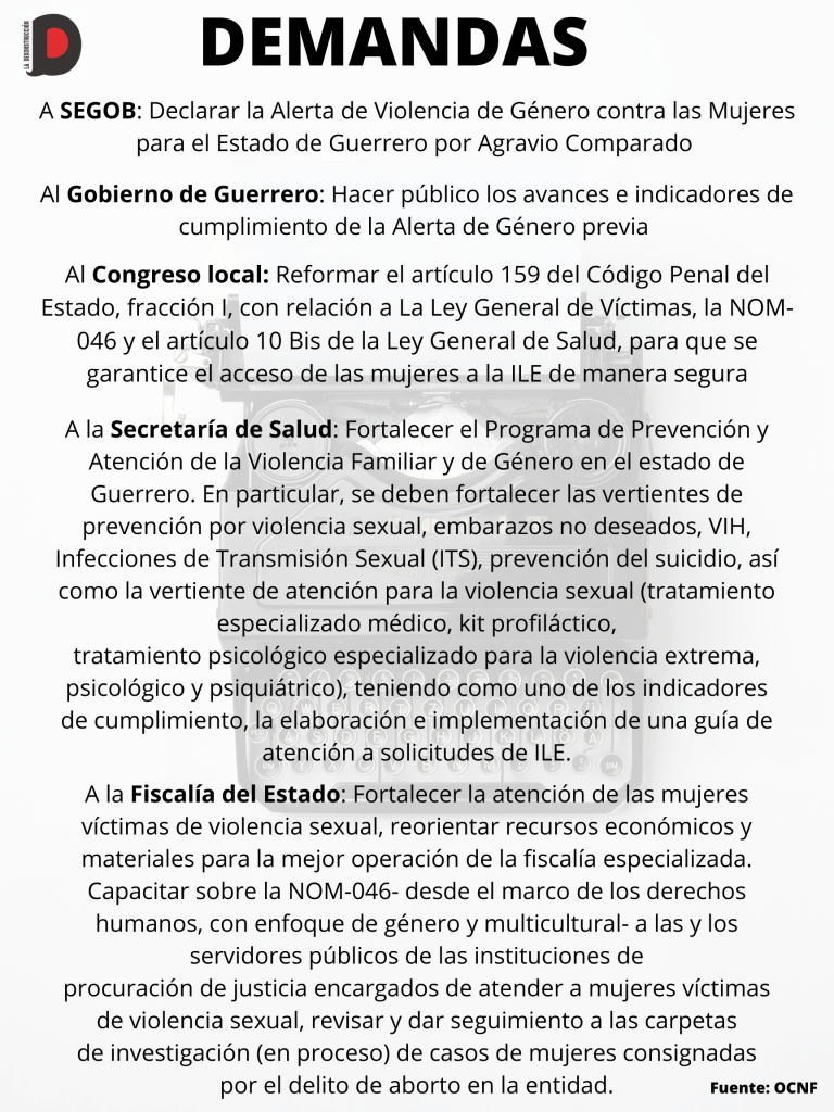 Organizaciones de la Sociedad Civil urgieron a la Secretaría de Gobernación federal a que declare la Alerta de Violencia de Género contra las Mujeres por Agravio Comparado, lo anterior, a un año de que la Comisión Nacional para Prevenir y Erradicar la Violencia contra las Mujeres (CONAVIM) notificara a los titulares de los poderes Ejecutivo, Legislativo y la Fiscalía de Guerrero, las recomendaciones emitidas en un informe que evidenció la situación de discriminación y violencia en contra las mujeres y la falta de acceso a servicios especializados de salud que incluyen la interrupción legal del embarazo.