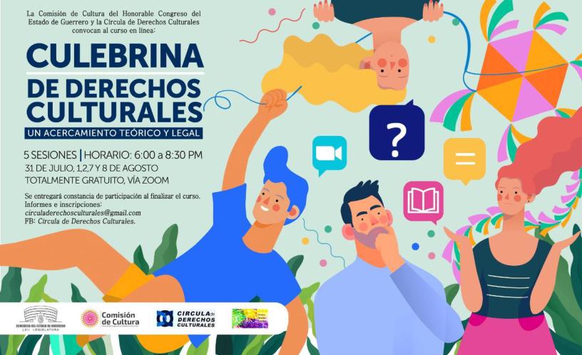 La Comisión de Cultura del H. Congreso del Estado de Guerrero en colaboración con La Círcula de Derechos Culturales, impartirá el curso: Culebrina de Derechos Culturales: un acercamiento teórico y legal. Este se llevará a cabo vía Zoom los días 31 de julio, 1, 2, 7 y 8 de agosto de 2020 de 18:00 a 20:30 hrs.