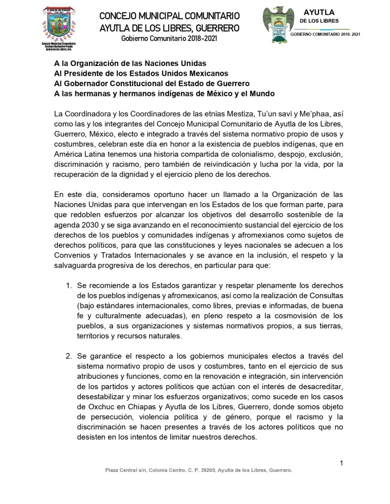 El Consejo Comunitario de Ayutla de los Libres lanzó un comunicado en el marco del Día Internacional de los Pueblos Indígenas, en el cual demanda, entre otros puntos, que se apruebe la reforma en materia de derechos indígenas y afromexicanos que actualmente se encuentra en iniciativa con proyecto de Decreto en el Congreso de Guerrero, además de denunciar que en contra de su gobierno persiste la persecución, violencia política y de género.