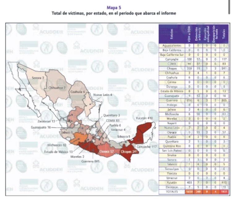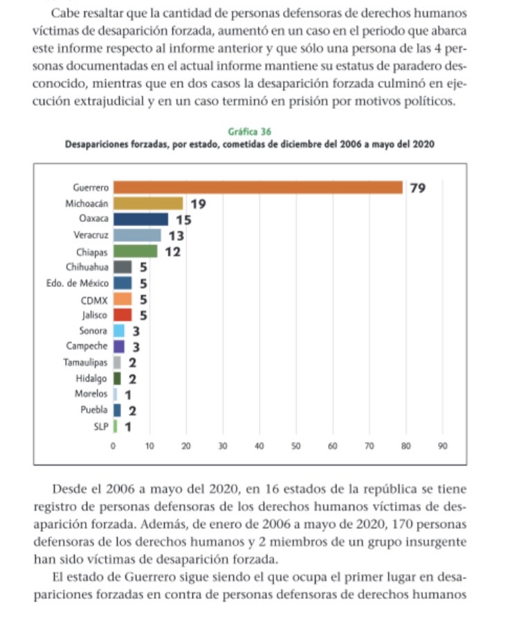 En Guerrero según el informe: “Defender los Derechos Humanos en México: la impunidad no termina”, se registró el mayor número de otras Violaciones a los Derechos Humanos (VDH) de personas defensoras (856 casos) además de documentarse 3 ejecuciones extrajudiciales, 2 desapariciones forzadas y 4 detenciones arbitrarias en el periodo del 1 junio de 2019 al 31 de mayo de 2020, siendo el estado del país con más víctimas; un total de 865.