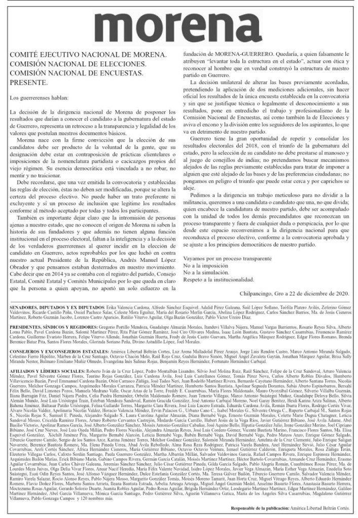 Luego de que se diera a conocer el desplegado a nivel estatal, una comisión morenista dio una conferencia de prensa en Chilpancingo en la cual leyeron el documento señalando que posponer los resultados de una encuesta señalada en la convocatoria representa un retroceso en la transparencia de una elección que debe ser voluntad de la gente, no de imposiciones o simulaciones siguiendo las máximas de no robar, no mentir y no traicionar ya que al haber emitido al convocatoria no debieron alterar el proceso.