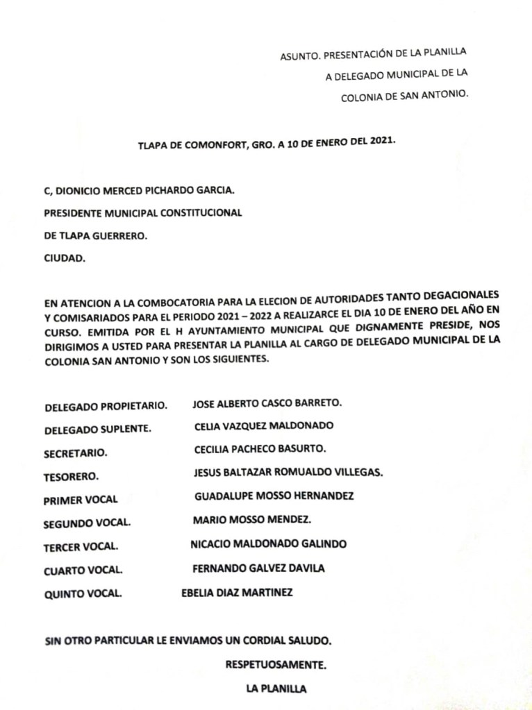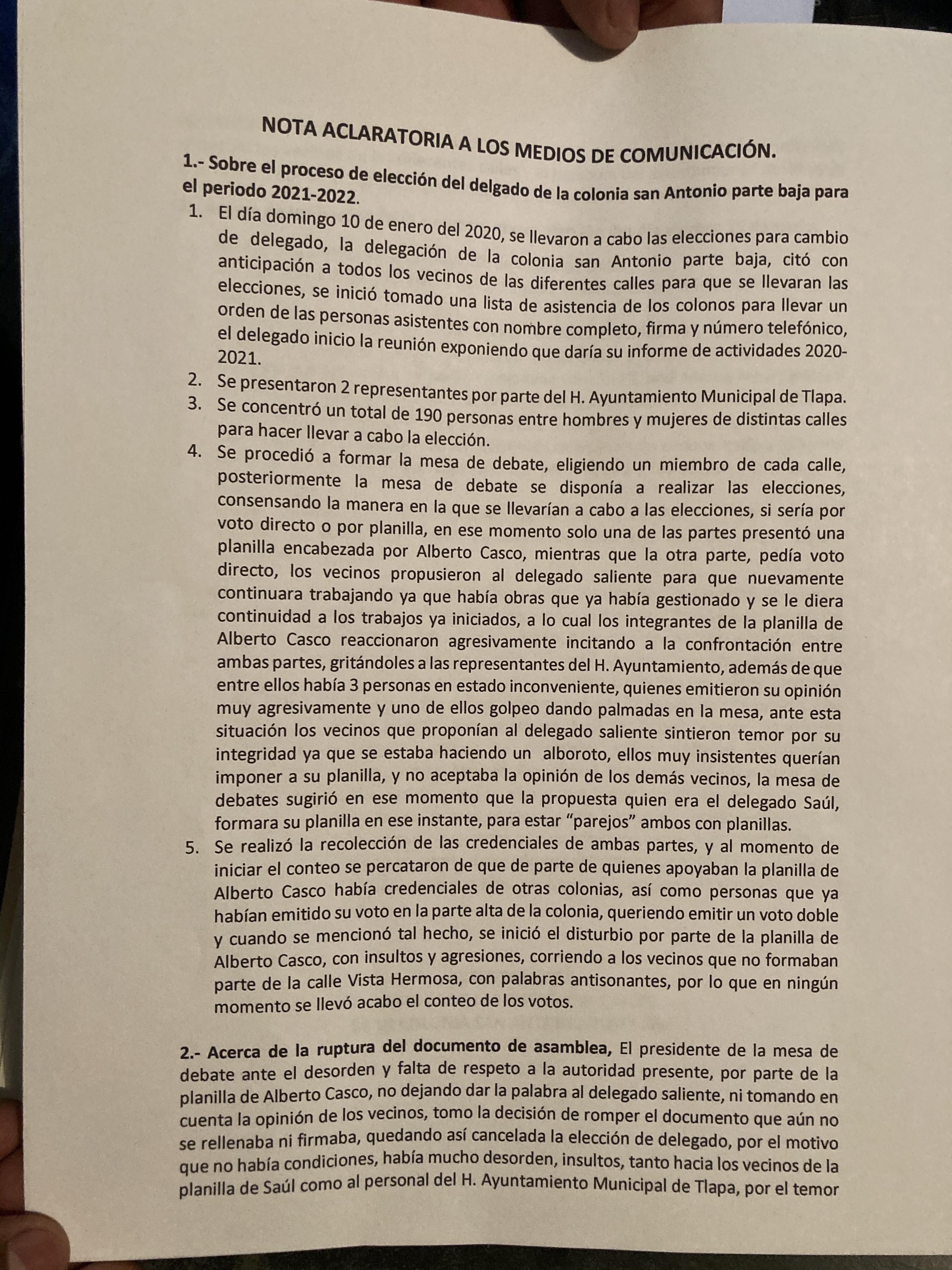 En el texto informan que el actual delegado no quiere reelegirse como dice la otra parte, sino que es la voluntad de la mayoría de vecinos que quieren al joven Saúl Velázquez por tercera ocasión. “Es un joven con cualidades, se ha esmerado, además no queremos divisionismo, el PT está llamando al odio contra nosotros pero estamos muy unidos”, se pronunciaron ante medios.