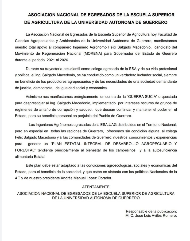 Chilpancingo, Gro., 22 de febrero de 2021. La Asociación Nacional de Egresados de la Escuela Superior de Agricultura (ESA) se manifestó «enérgicamente en contra de la guerra sucia orquestada para desprestigiar» a Félix Salgado Macedonio, candidato de Morena a la gubernatura de Guerrero.