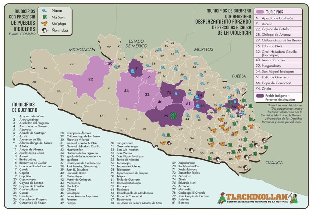 El gobierno no tiene el poder ni controla, son los grupos de la delincuencia organizada quienes mantienen asediadas a las comunidades indígenas y pobres del Estado. Hay una herida abierta en la Sierra de Guerrero. De los 81 municipios, en 15 se tiene registro de desplazamiento. Hay centenas de familias desplazadas de los municipios de Chilapa, Tlacotepec, Coyuca de Catalán, San Miguel Totolapan, entre otros, que no han sido atendidos por las autoridades estatales y federales. Son poblaciones en estado de indefensión.