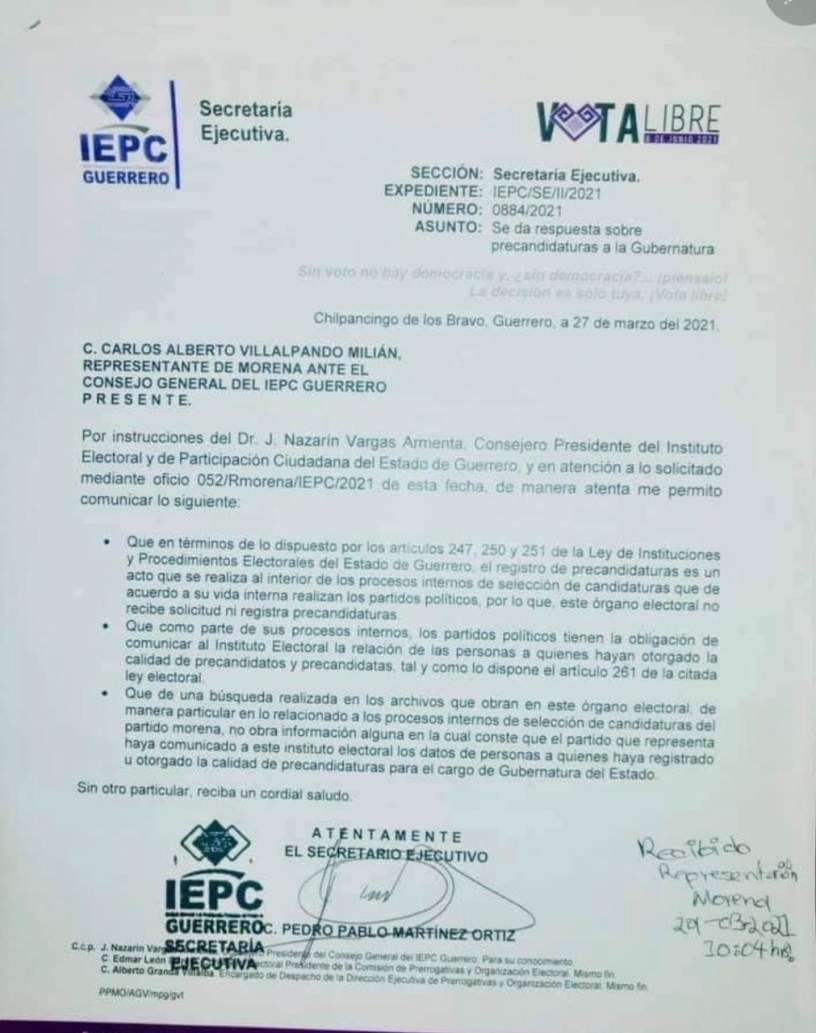 El sábado 27 de marzo, el representante de Morena ante el IEPC, Carlos Alberto Villalpando Milián, solicitó al órgano electoral la información sobre precandidaturas a la gubernatura de Guerrero, mediante oficio 052/Rmorena/IEPC/2021.