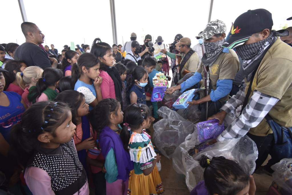 Antes de finalizar el evento, en la cancha techada de esta comunidad, se formaron a los niños para que los comunitarios los «armaran», pero a diferencia de las autodefensas de Ayahualtempa, en esta ocasión las armas entregadas a los niños fueron juguetes y dijeron que la mejor arma para los niños es que sigan siendo niños y se les pueda brindar la seguridad y educación que tanto piden.