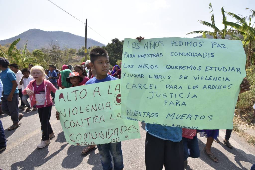 Alcozacán, Chilapa, Guerrero. -Bajo la consigna de «ni pistolas, ni amapolas, queremos ver las olas», cientos de niños y niñas provenientes de 24 comunidades del municipio de Chilapa de Álvarez, marcharon en la localidad de Alcozacán para hacer un llamado de justicia a las autoridades y se les brinde la seguridad que han solicitado desde hace más de un año.