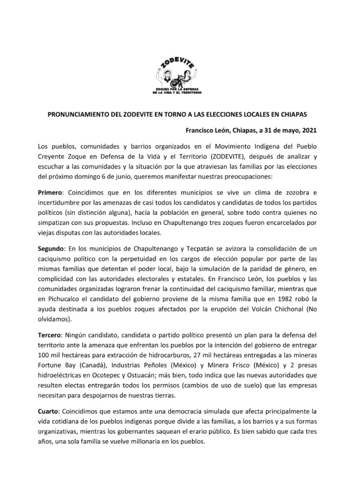 Los pueblos, comunidades y barrios organizados en el Movimiento Indígena del Pueblo Creyente Zoque en Defensa de la Vida y el Territorio (ZODEVITE), después de analizar y escuchar a las comunidades y la situación por la que atraviesan las familias zoques por las elecciones del próximo domingo 6 de junio, queremos manifestar nuestras preocupaciones: