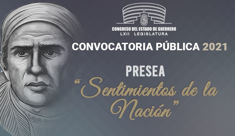 La Comisión Especial encargada de expedir la convocatoria y dictaminar sobre las candidaturas que se presenten para el otorgamiento de la Presea “Sentimientos de la Nación” del Honorable Congreso del Estado Libre y Soberano de Guerrero, en términos de los artículos 324, 325, 326, 327 y 328 fracción I de la Ley Orgánica del Poder Legislativo del Estado de Guerrero Número 231 y del Resolutivo Segundo del Acuerdo Parlamentario de fecha 4 de agosto del año 2021, a nombre del H. Congreso del Estado Libre y Soberano de Guerrero:
