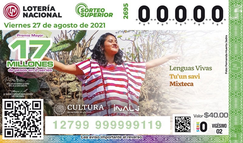 Ciudad de México, a 25 de agosto de 2021.- La Secretaría de Cultura del Gobierno de México, a través del Instituto Nacional de Lenguas Indígenas (INALI), y la Lotería Nacional (Lotenal) develaron hoy el billete del sorteo superior número 2695, alusivo a la lengua tu’un savi (mixteco), en el marco del proyecto “Culturas Vivas”, cuyo objetivo es difundir la diversidad lingüística y cultural de México.