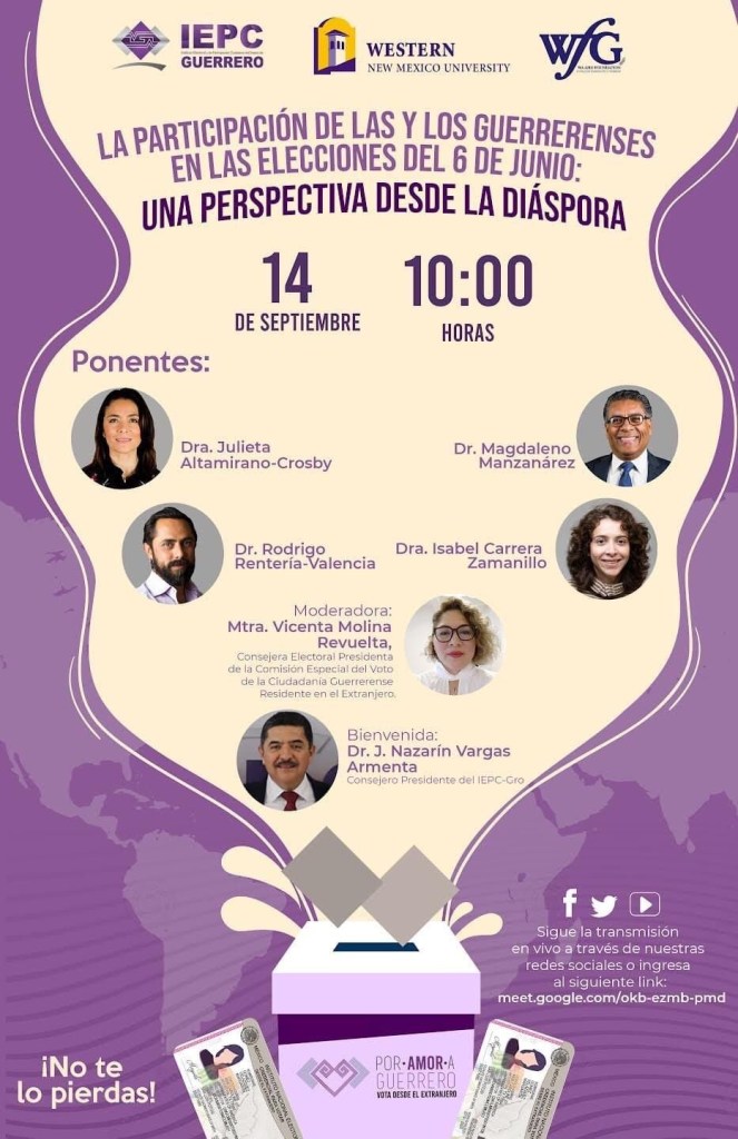 El día de hoy se llevó a cabo el seminario “La participación de las y los guerrerenses en las elecciones del 6 de junio: una perspectiva desde la diáspora”, que organizó este instituto electoral a través de la Comisión Especial para el Voto de la Ciudadanía Guerrerense Residente en el Extranjero, cuya finalidad fue presentar un estudio académico sobre el comportamiento de las y los connacionales guerrerenses en Estados Unidos respecto a su participación en la pasada elección de la gubernatura del estado, realizado por un grupo de investigadores y académicos residentes en aquel país.