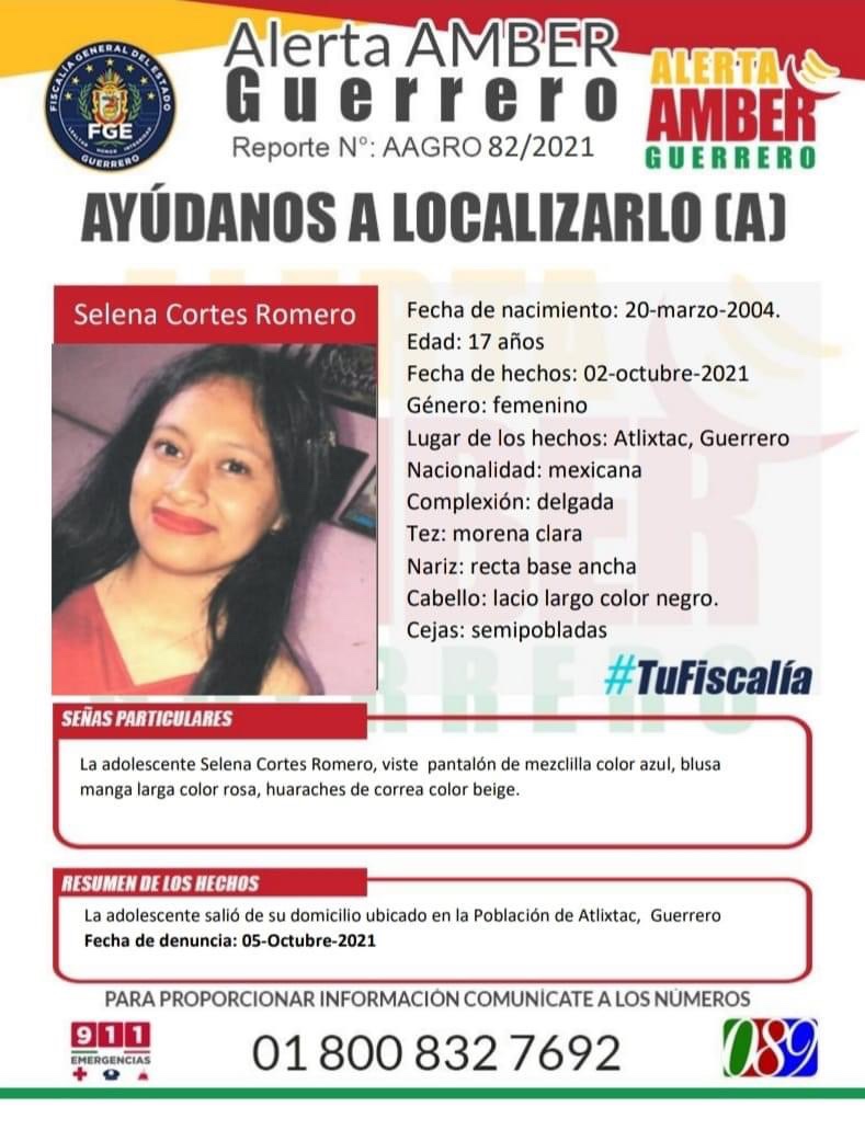 Selena Cortes Romero es una joven de 17 años que vive en Atlixtac, en la Montaña de Guerrero. Se sabe que desapareció el 2 de octubre. La alerta fue publicada en redes sociales el 5 de octubre. A decir de personas que han difundido la desaparición, la Fiscalía no está investigando con perspectiva de género ni con la premura necesaria para que pudiera ser localizada.
