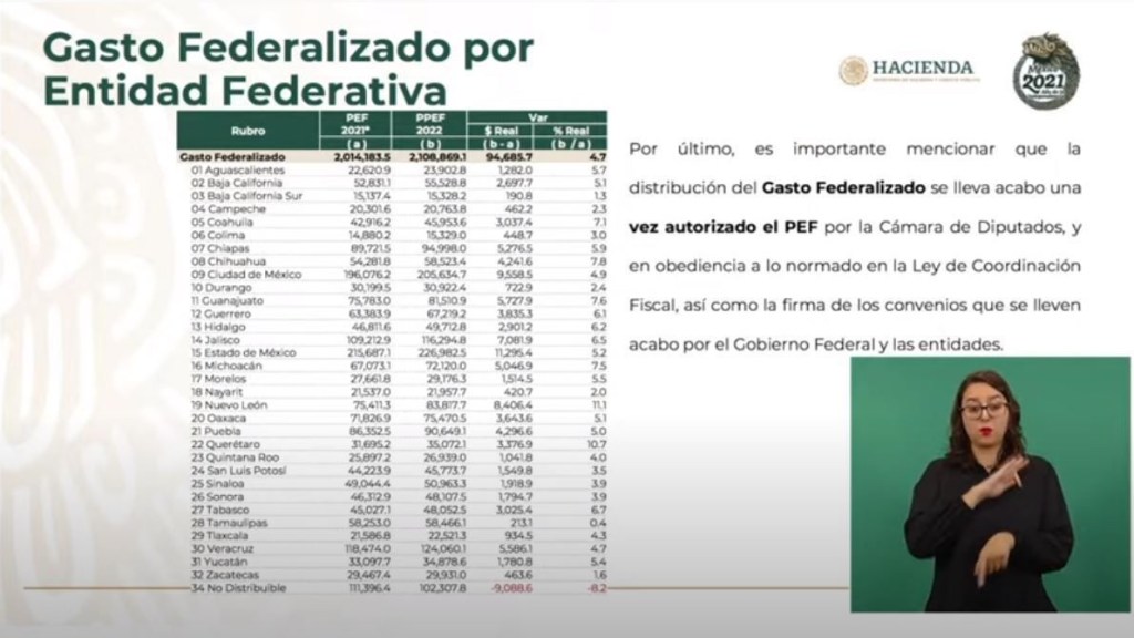 Chilpancingo, Gro., 04 de noviembre.- El estado de Guerrero tendrá un incremento del 6.1 por ciento en el Gasto Federalizado, al pasar de 63 mil 383.9 millones de pesos en el 2021 a 67 mil 219.2 millones de pesos para el 2022, informó la subsecretaria de Egresos de la Secretaría de Hacienda, Victoria Rodríguez Ceja, durante la conferencia de prensa matutina del Presidente Andrés Manuel López Obrador.
