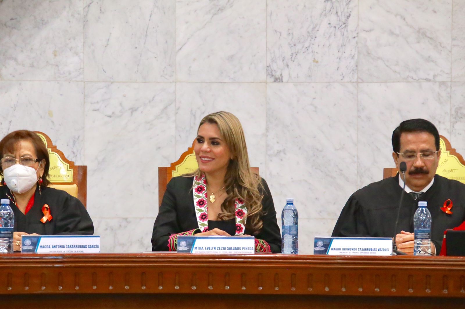 Chilpancingo, Gro. 01 de diciembre de 2021.- La gobernadora Evelyn Salgado Pineda, asistió como invitada de honor a la toma de protesta del Magistrado Raymundo Casarrubias Vázquez como presidente del Tribunal Superior de Justicia y del Consejo de la Judicatura del Poder Judicial del Estado de Guerrero para el periodo 2021 – 2024; la titular del Poder Ejecutivo, convocó a transformar a fondo la vida pública de Guerrero en todos y cada uno de sus ámbitos, para generar bienestar desde cada uno de los poderes de gobierno.