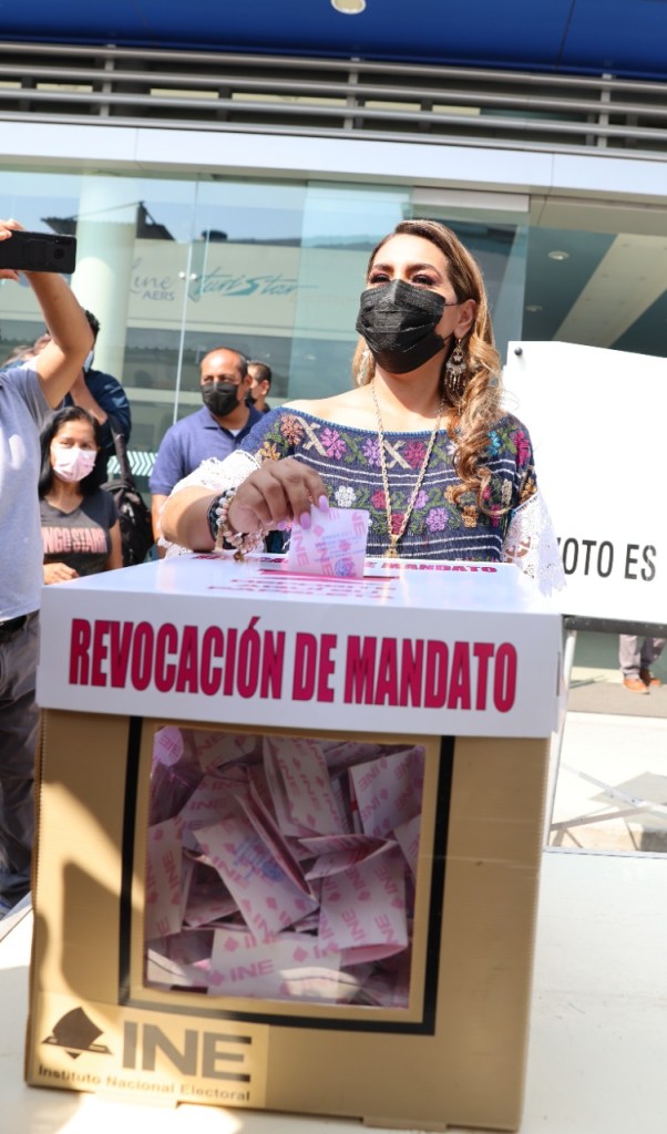 Luego de casi una hora de estar formada en la larga fila, en la casilla especial que se instaló en la central de autobuses, Salgado Pineda ejerció su voto sobre la revocación de mandato del actual presidente Andrés Manuel López Obrador.