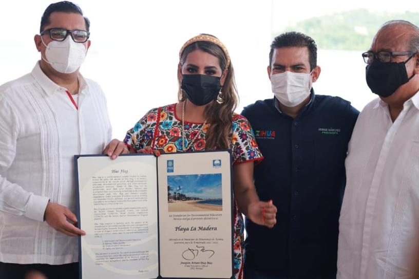 La mandataria estatal visitó la Playa La Madera, en donde se realizó el izamiento de bandera y la entrega del distintivo Blue Flag; además de la recertificación a las playas La Ropa y el Palmar en sus secciones I, II y III. Con ello Zihuatanejo suma cinco playas con certificación de excelencia.