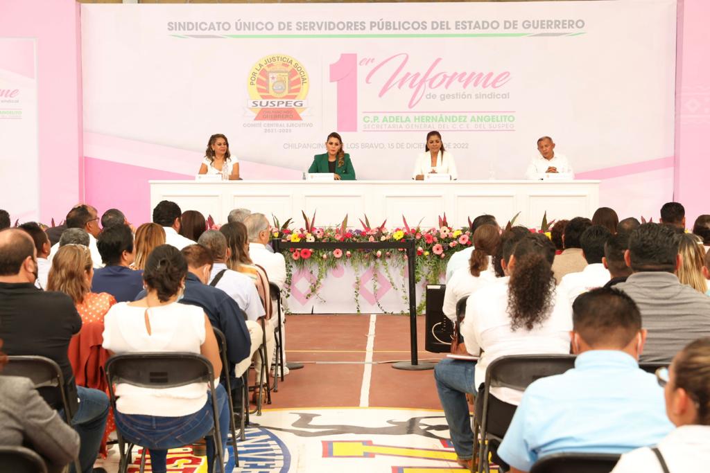 Chilpancingo, Gro., 15 de diciembre de 2022. – La gobernadora Evelyn Salgado Pineda, refrendó su compromiso con fortalecer los derechos y conquistas sindicales de la base trabajadora del estado, además de cumplir en tiempo y forma con las prestaciones de ley, expresó lo anterior, al asistir al Primer Informe de Gestión Sindical de la Secretaria General del SUSPEG, Adela Hernández Angelito, donde reconoció los resultados en favor de este gremio que se suman para lograr la consolidación de la transformación del estado de Guerrero.