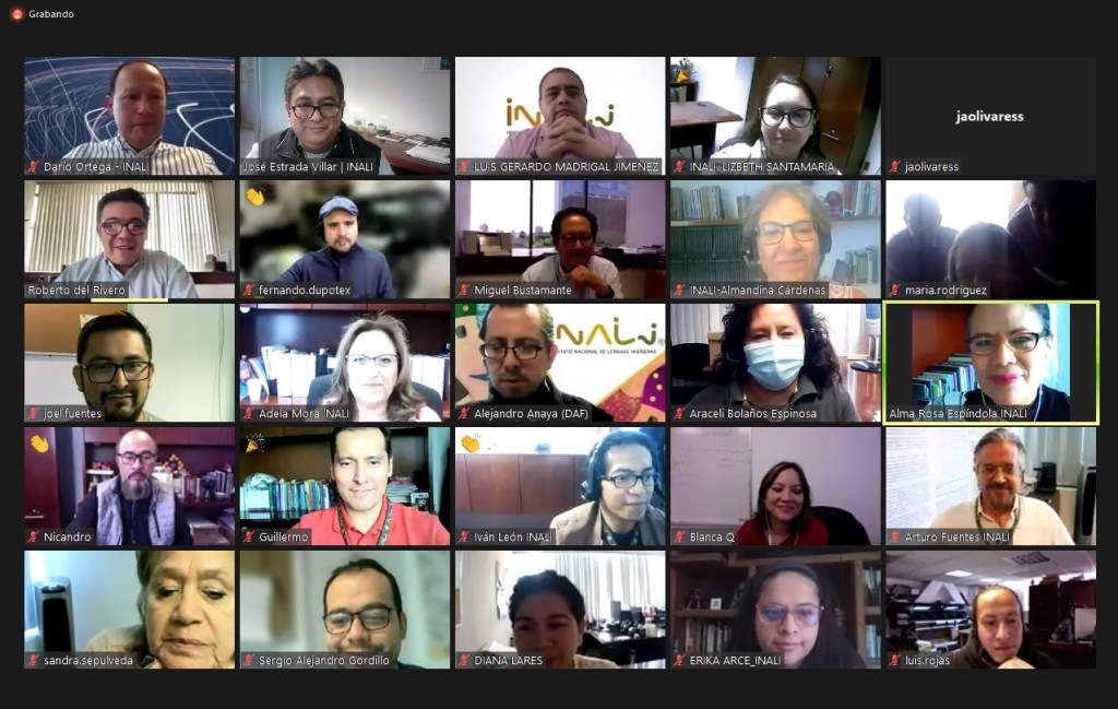 Durante una reunión virtual, la encargada del despacho de la Dirección General del Inali, Alma Rosa Espíndola Galicia, recordó que con esta acción se contribuye al cumplimiento del objetivo prioritario de mejorar las condiciones para la igualdad sociolingüística de la población Indígena, indicado en el Programa Institucional 2020-2024.