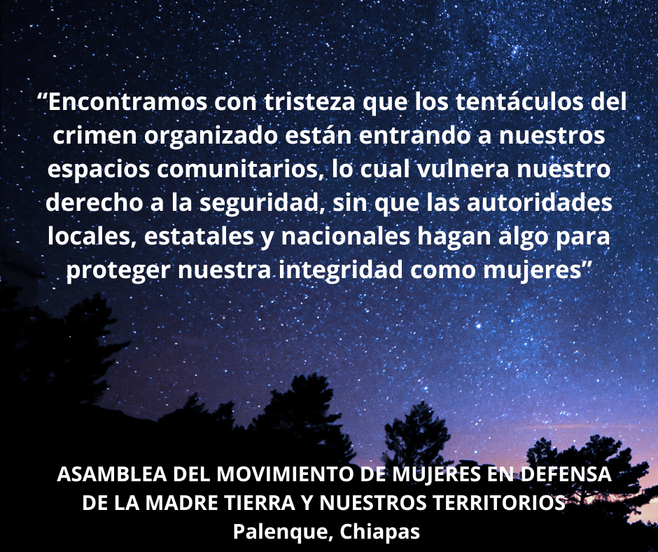 Coincidimos en que el crimen organizado ha incrementado de una forma incontrolable de febrero a septiembre: cobro de piso, desaparición de jóvenes y jóvenas, ejecuciones constantes con total desprecio a la vida. La población queda expuesta a ser sometida por el accionar del crimen organizado. Reafirmamos que a pesar de todo esto las mujeres seguimos con voluntad para seguir organizadas y animar a más mujeres y jóvenes a seguir este camino por la vida, por la Madre Tierra, por la libertad, en defensa de nuestros derechos. Lo seguiremos haciendo continuando nuestra próxima asamblea con fuerza, alegría, esperanza, amor y mucha dignidad.