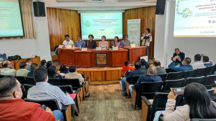 En la reunión efectuada en el auditorio “Jaime Litvak King” del Instituto de Investigaciones Antropológicas (IIA) de la Universidad Nacional Autónoma de México (UNAM), la representante del Comité Traductor de la Norma de Escritura de la Lengua Mexihkatlahtolli (Náhuatl), Erika Sebastián Aguilar, que dio su intervención totalmente en náhuatl, dijo que con la norma de escritura de este idioma, que se desarrolla en forma colectiva, se puede materializar una transformación social de la realidad de los pueblos y comunidades, “asediados por el sistema capitalista, que insistió en borrarnos como pueblo originario”.