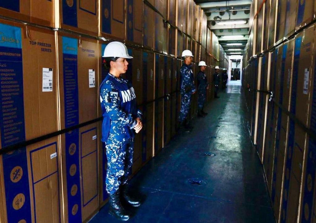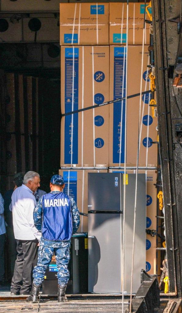 La gobernadora y el presidente, supervisaron el desembarque de enseres en el muelle de la Décima Segunda Región Naval después de su participación en la conferencia matutina donde presentaron avances que se han logrado como parte del Plan de Reconstrucción en Acapulco y Coyuca de Benítez, después del huracán Otis.