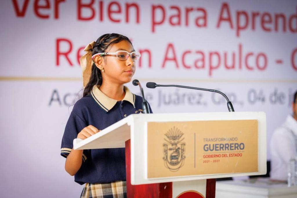 A nombre de los beneficiarios, la alumna Jimena López Eugenio, de quinto grado, agradeció a la gobernadora su apoyo hacia la niñez y juventud, ofreciendo más y mejores condiciones para su correcto desarrollo, con una gran visión a futuro. «Es un honor para nuestra escuela primaria contar con su presencia y valioso apoyo que hoy nos brinda a los alumnos con el programa Ver Bien para Aprender Mejor. Gracias a eso elevamos nuestra calidad educativa, nuestro reconocimiento a una gobernadora entregada a su pueblo, la primer mujer gobernadora de nuestro bello estado de Guerrero», dijo.
