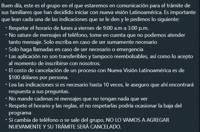 El caso de Nueva Visión Latinoamérica no es nuevo. La primera queja que recibimos de una persona estafada fue en septiembre de 2018, cuando una persona fue expulsada por alzar la voz por los sobreprecios, esta no fue la única en los meses y años siguientes, éstas siguieron llegando. Las constantes amenazas de Palacios de sacar del programa a quien se quejaba, provocaron miedo un miedo tal que hacía permanecer callados a los migrantes.
