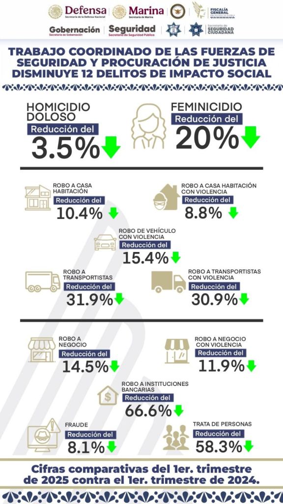 CIUDAD DE PUEBLA, Pue.- Como parte de la estrategia de seguridad que ha marcado la presidenta de la República, Claudia Sheinbaum Pardo, y resultado de la coordinación interinstitucional entre las Secretarías de la Defensa Nacional (SEDENA), de Marina (SEMAR), Guardia Nacional (GN), la Secretaría de Seguridad Pública del Estado, la Fiscalía General del Estado y autoridades municipales, la incidencia delictiva tuvo una disminución en 12 delitos de impacto social en el estado de Puebla, tratándose del homicidio doloso, el feminicidio, los robos a casa habitación, de vehículo con violencia, a transportistas, a negocios, a instituciones bancarias, así como el fraude y la trata de personas.
