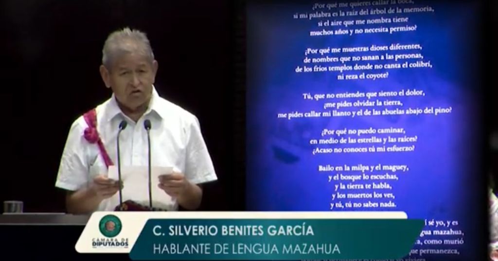 En la sesión de la Cámara de Diputados y al participar en el marco de la iniciativa denominada “Las lenguas toman la tribuna”, Silverio Benites García, hablante de mazahua, externó su deseo de enseñar su lengua y evitar que desaparezca.
