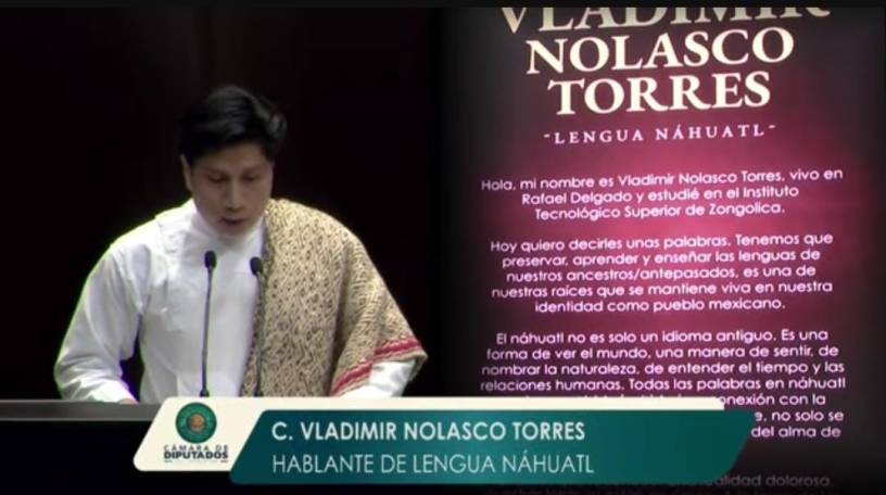 Ante diputadas y diputados, Vladimir Nolasco Torres, hablante de lengua náhuatl, hizo un llamado a preservar, aprender y enseñar las lenguas de sus ancestros o antepasados, ya que son una de las raíces que mantienen viva su identidad como pueblo mexicano.