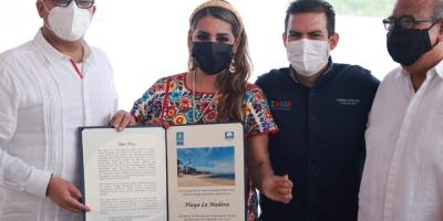 Evelyn Salgado iza bandera Blue Flag en playa de Zihuatanejo